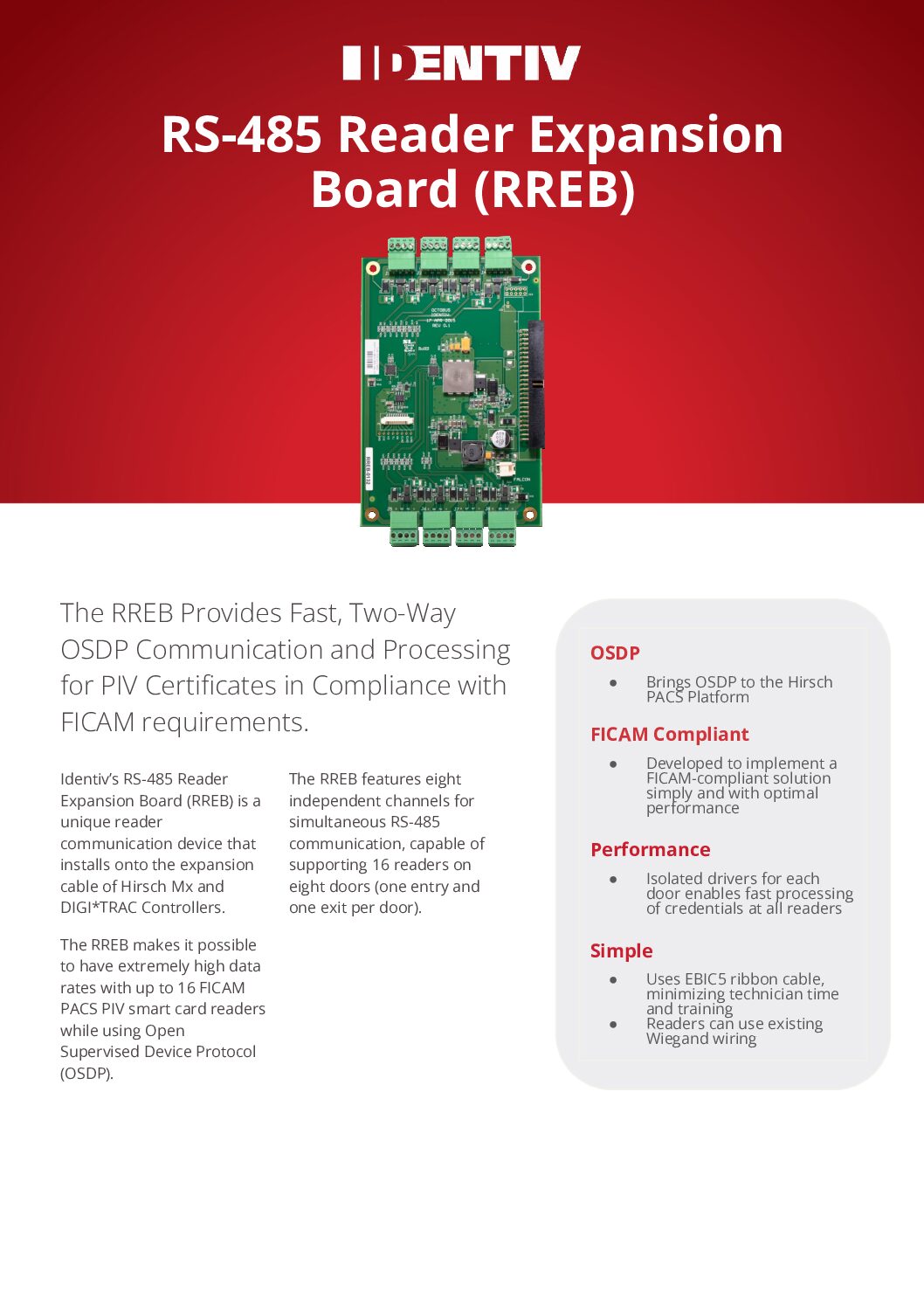Identiv’s RS-485 Reader Expansion Board (RREB) is a unique reader communication device that installs onto the expansion cable of Hirsch Mx and DIGI*TRAC Controllers. The RREB makes it possible to have extremely high data rates with up to 16 FICAM PACS PIV smart card readers while using Open Supervised Device Protocol (OSDP).